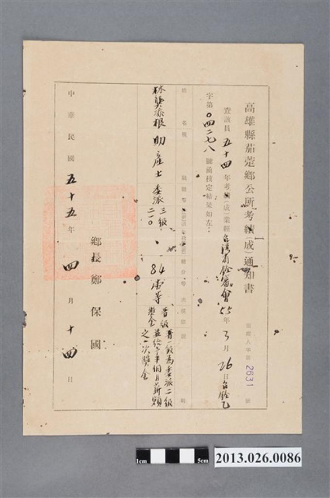 1966年4月14日高雄縣茄萣鄉公所林龔添根考績通知書