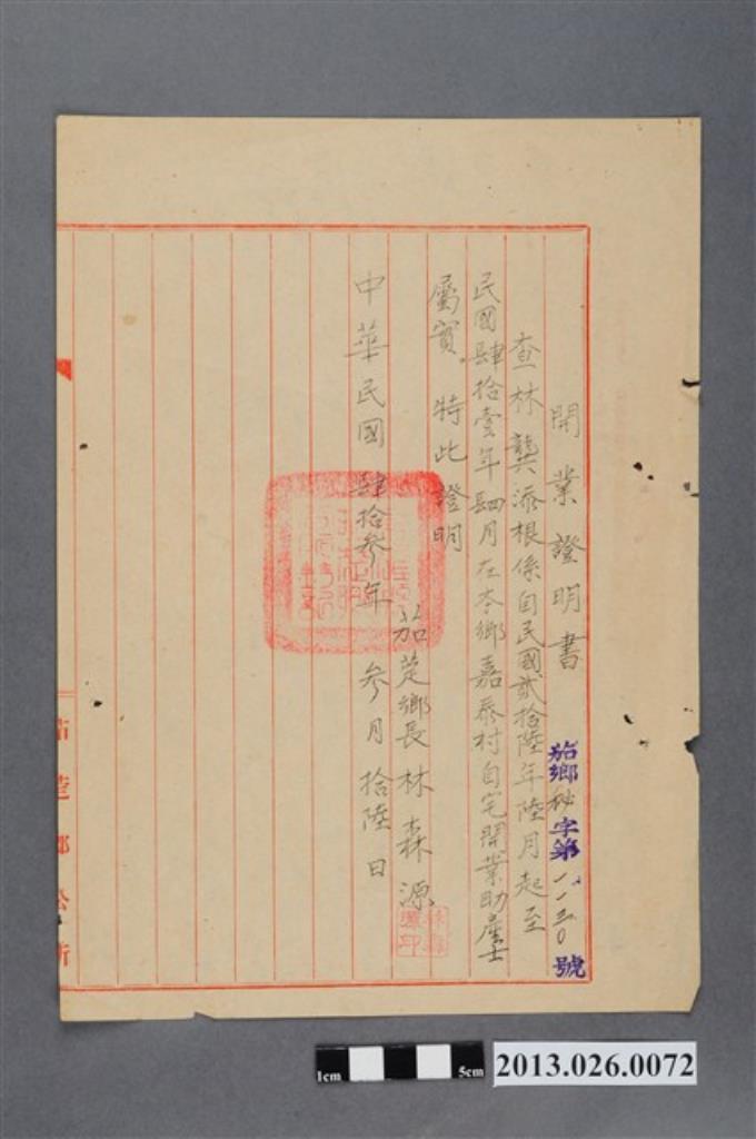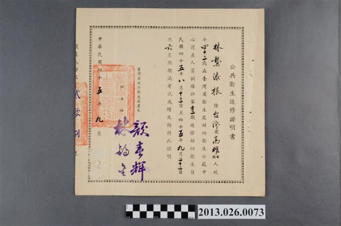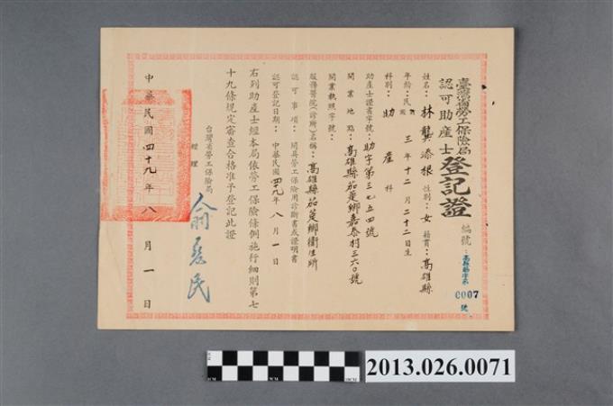 1960年8月1日台灣省勞工局認可助產士林龔添根登記證