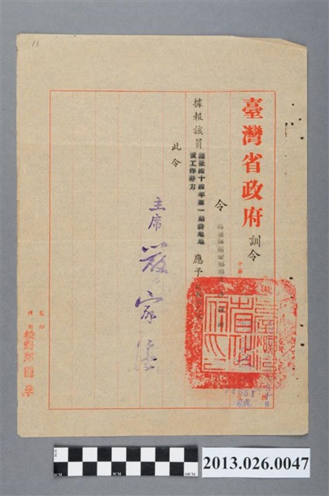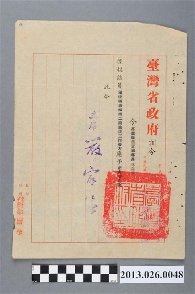 1956年臺灣省政府對高雄縣茄萣鄉長林森源辦理44年度第一期田賦實物征收工作努力記嘉獎一次之訓令