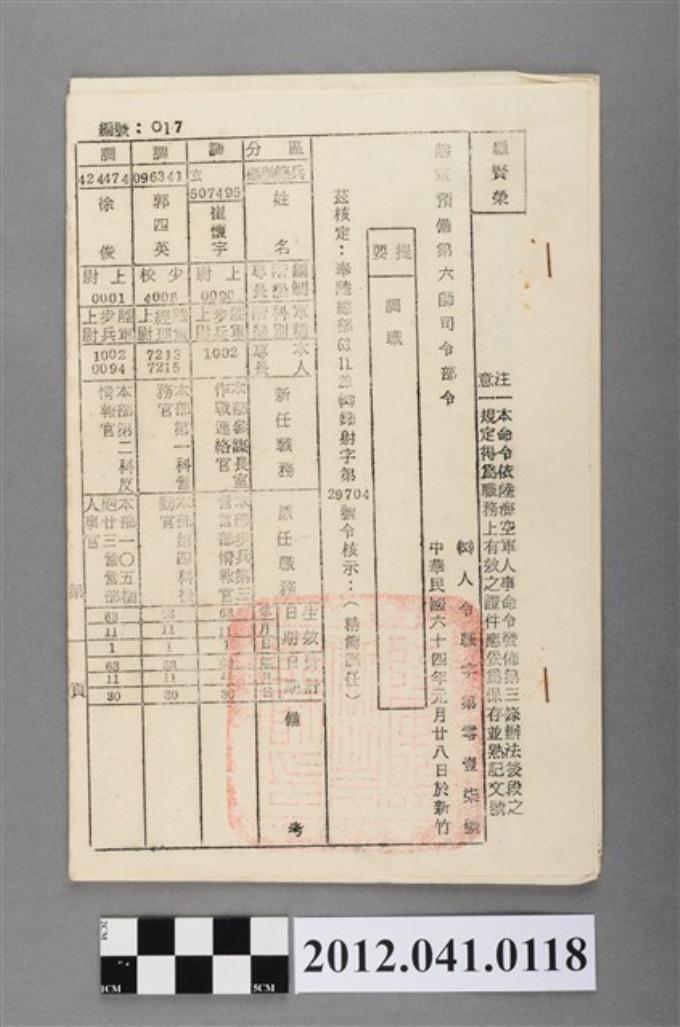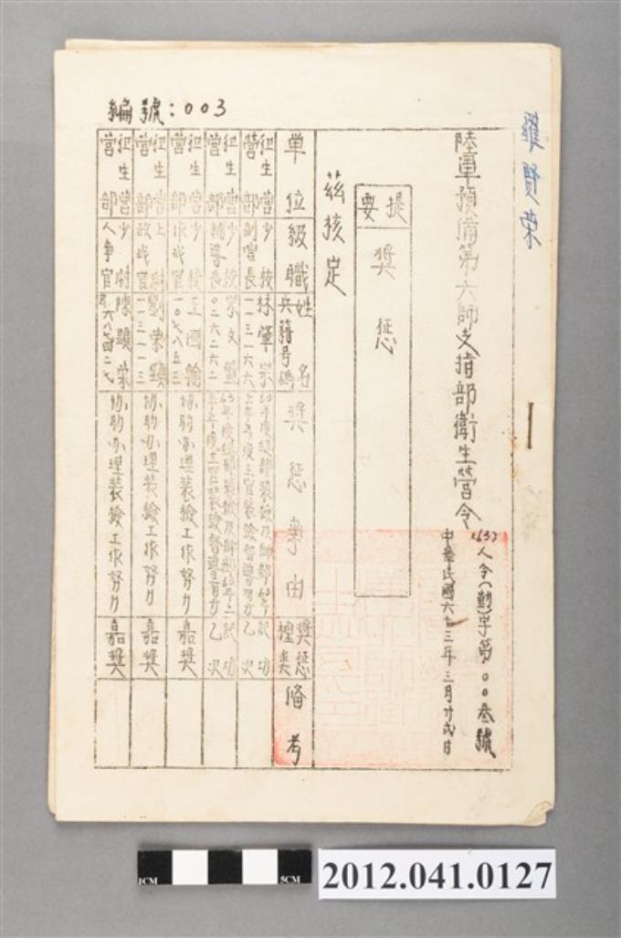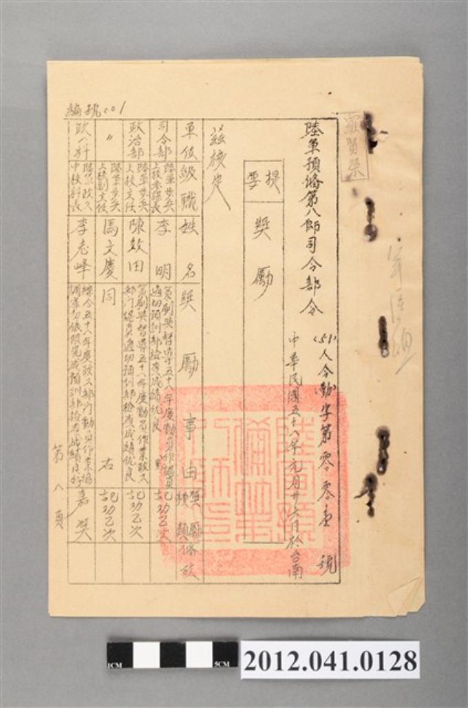 民國63年陸軍預備第六師支指部衛生營令獎勵公文