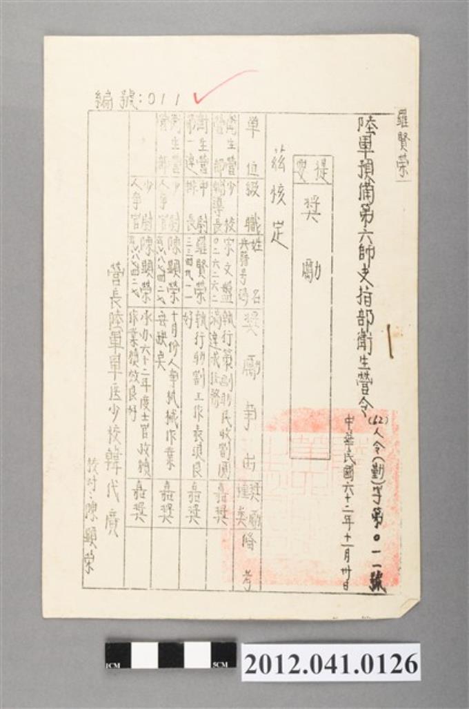 民國62年陸軍預備第六師支指部衛生營令獎勵公文