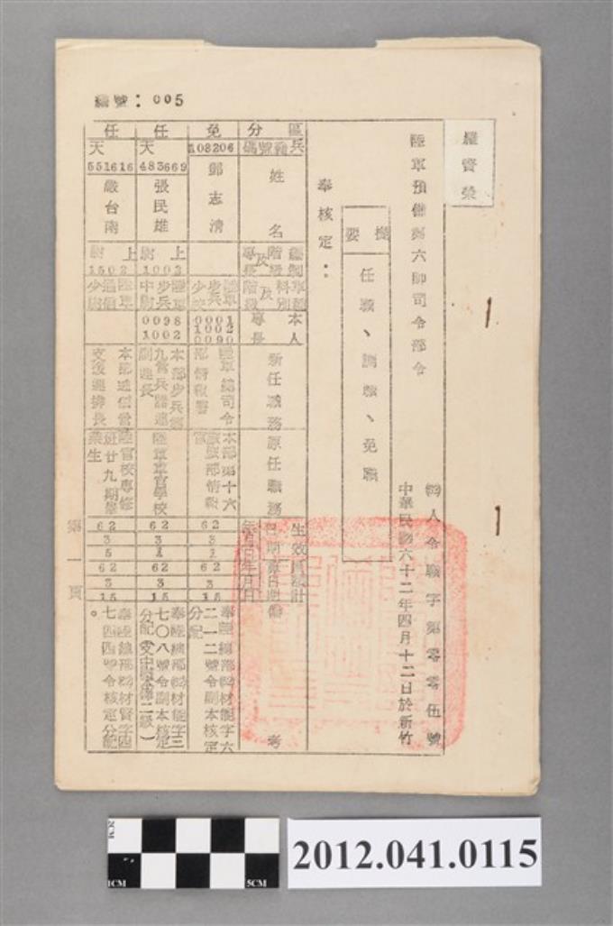 民國62年陸軍預備第六師司令部人事調動令