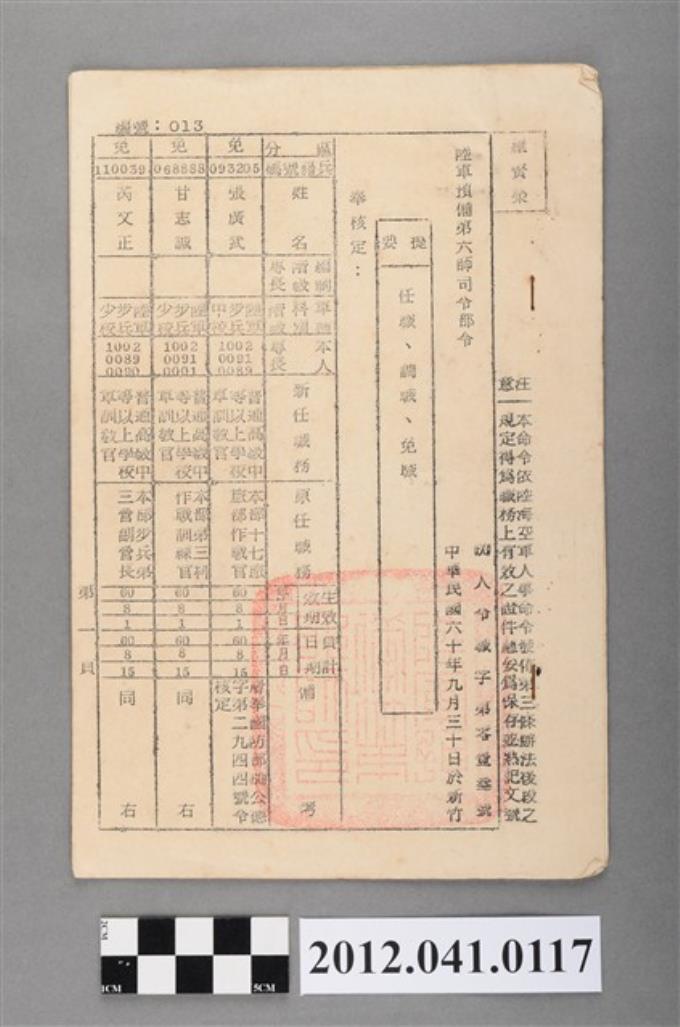 民國60年陸軍預備第六師司令部人事調動令