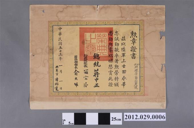 民國五十三年陸軍上士田永華忠勤勳章勳章證書