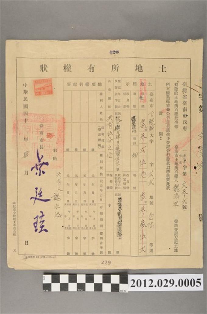 民國40年臺南市長土地所有權狀