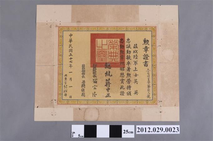 民國五十七年陸軍上士吳英忠勤勳章勳章證書
