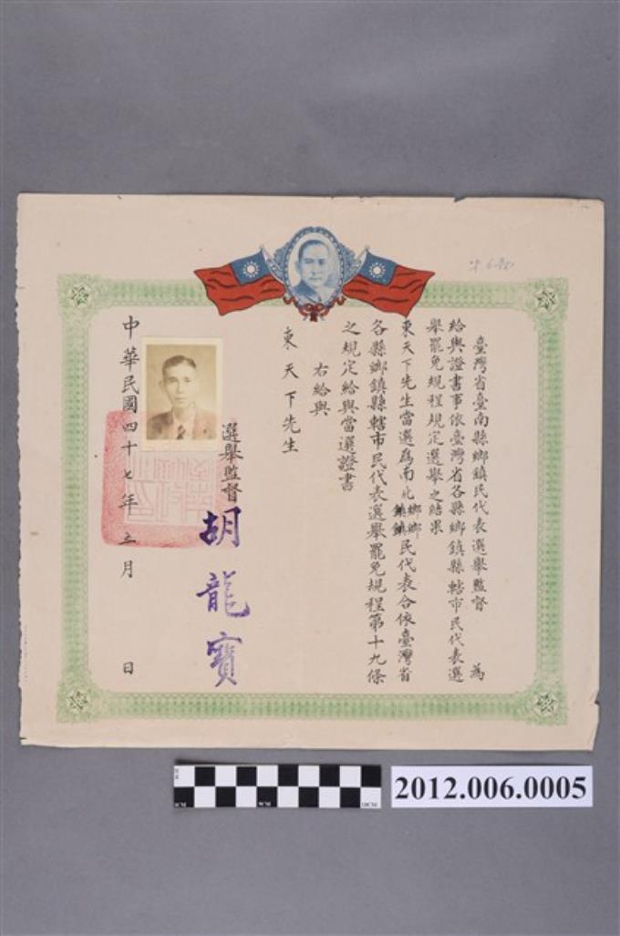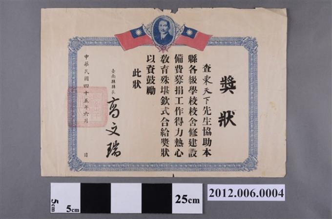 民國45年東天下協助各級學校校舍修建設備費募捐獎狀