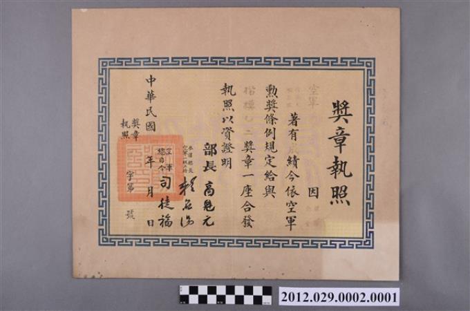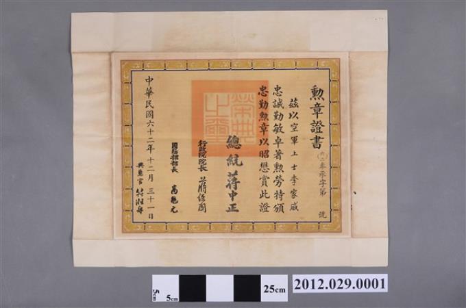 民國六十二年空軍上士李家威獲頒忠勤勳章之勳章證書