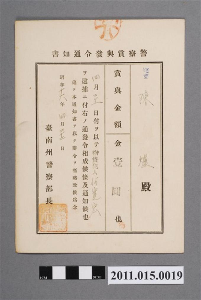 昭和16年臺南州警察部長臨時獎金發布通知書