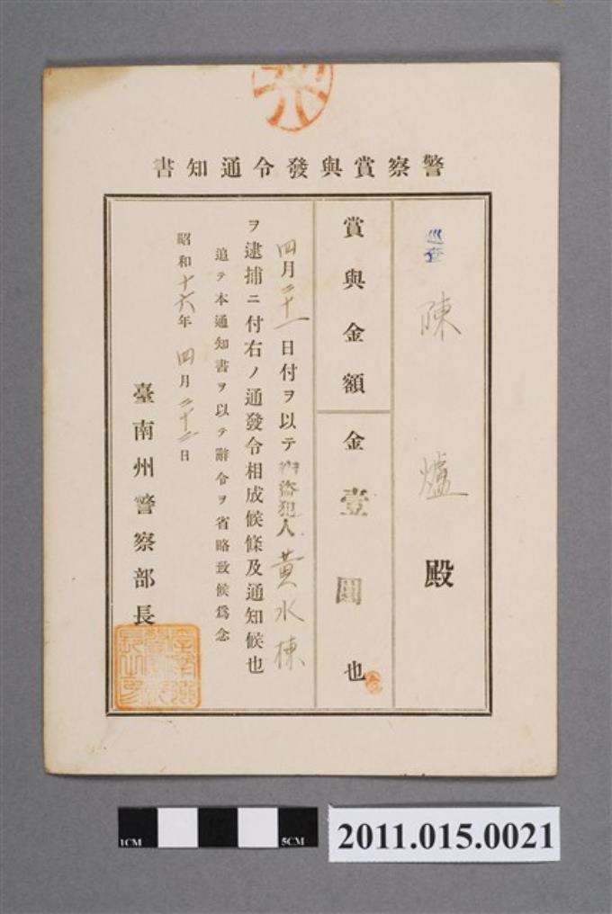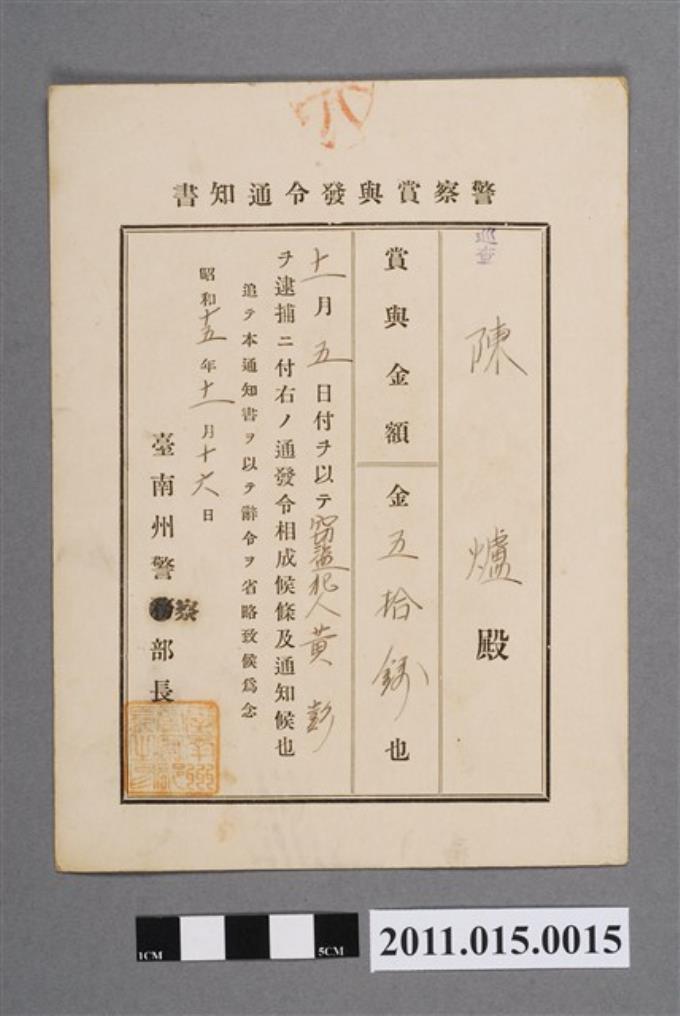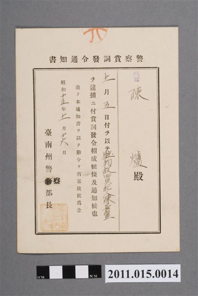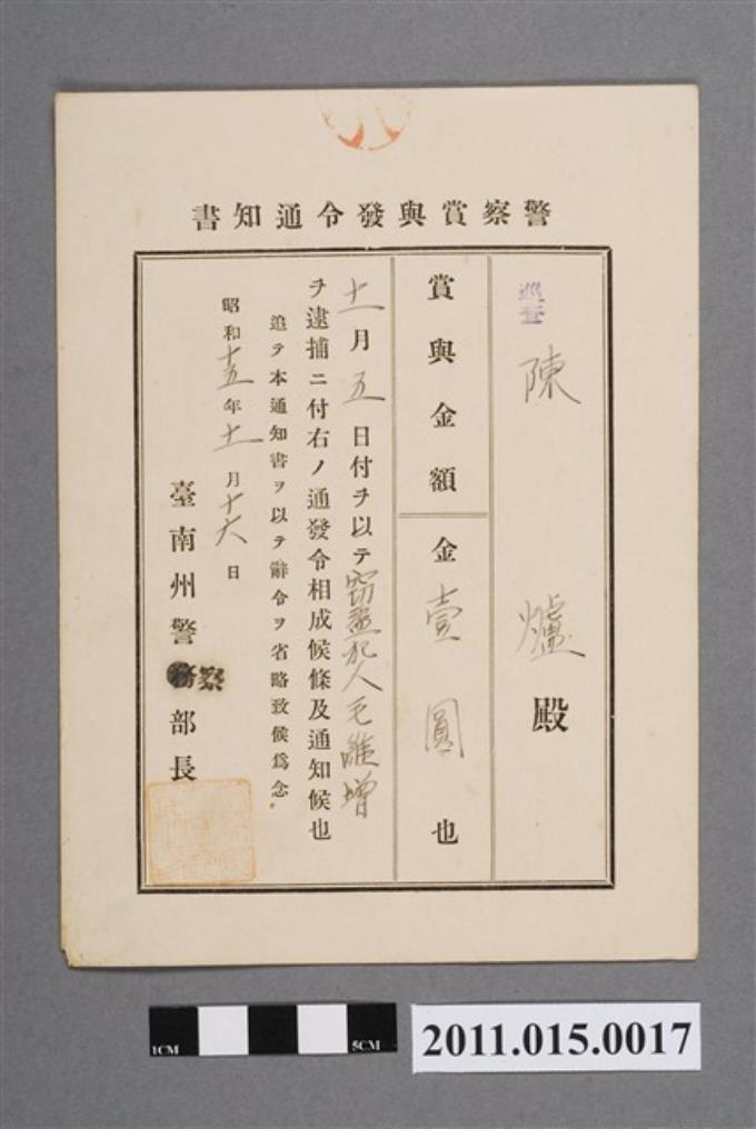 昭和15年臺南州警察部長警察讚賞詞發布通知書
