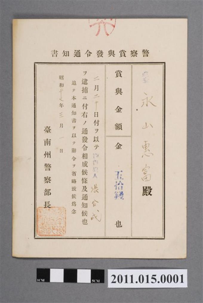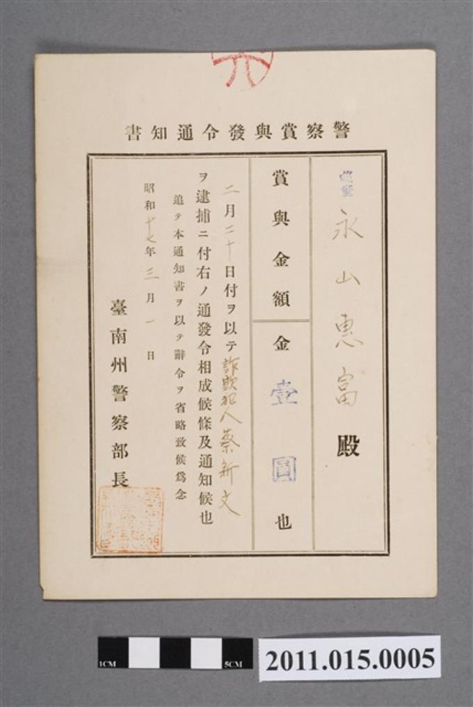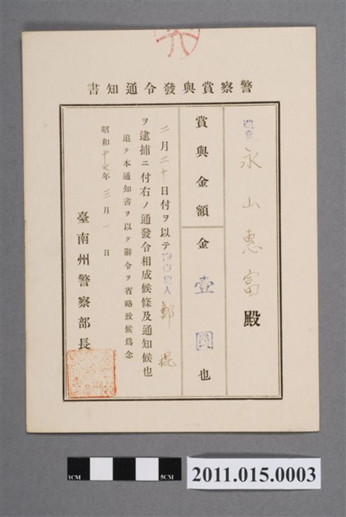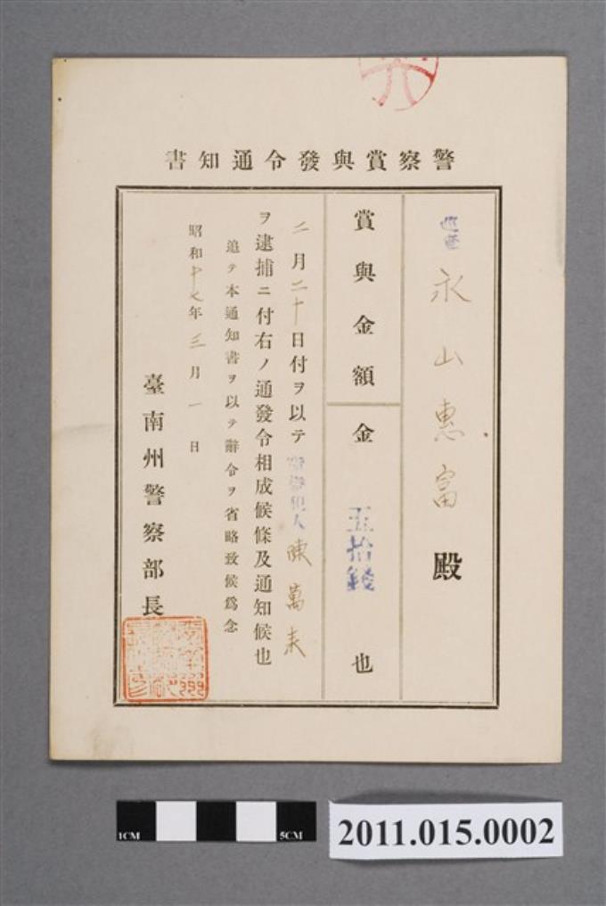 昭和17年臺南州警察部長給警察獎金發布通知書