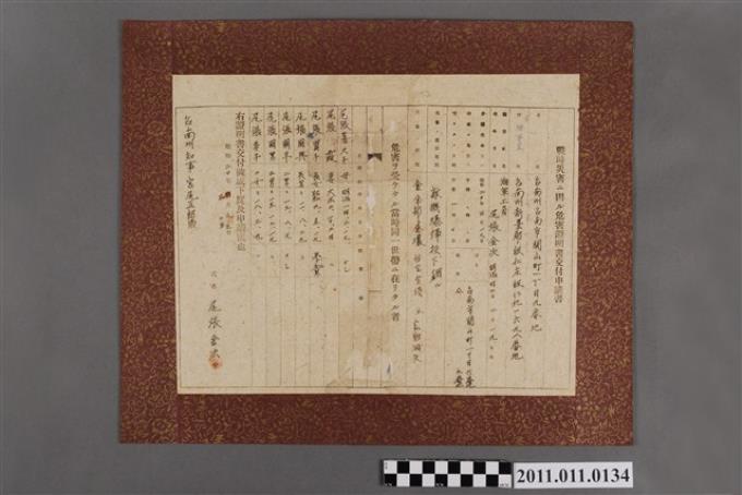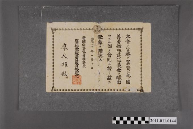 明治四十年廖天維捐贈帝國義勇艦隊徽章之獎狀