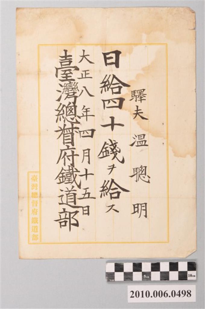 大正8年臺灣總督府鐵道部給溫聰明任職通知單
