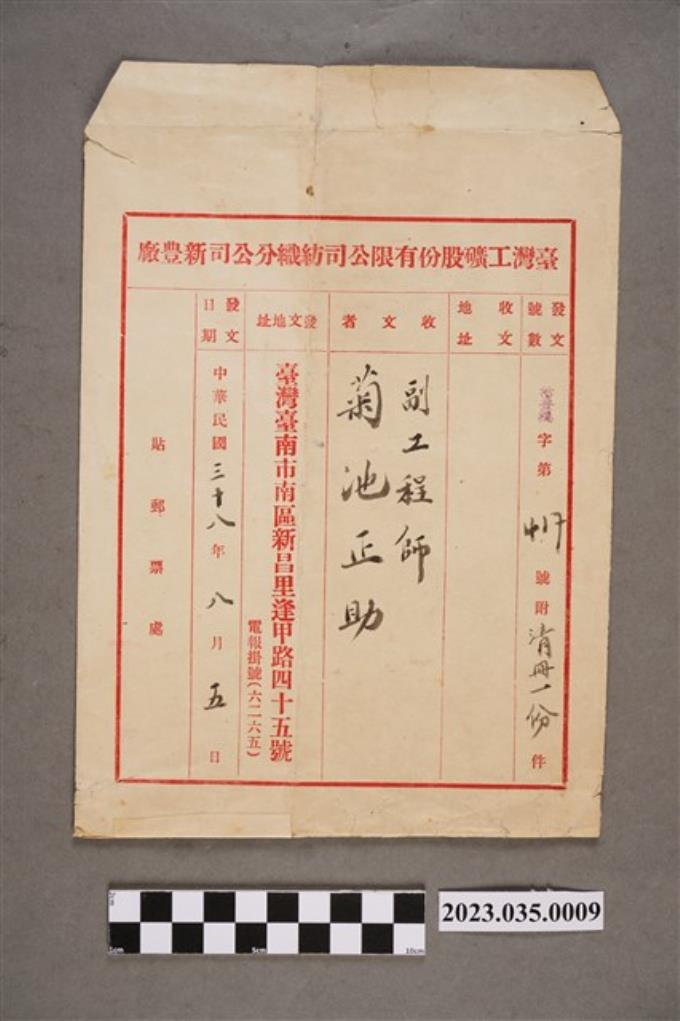 臺灣工礦股份有限公司紡織分公司新豐廠給副工程師菊池正助公文信封