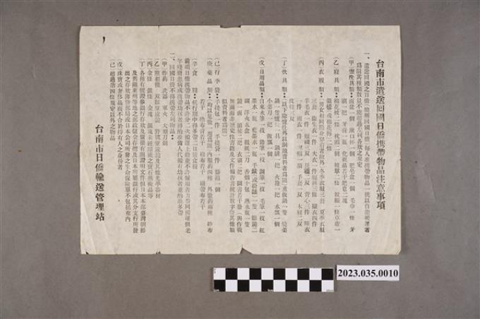 臺南市日僑輸送管理站製臺南市遣送回國日僑攜帶物品注意事項