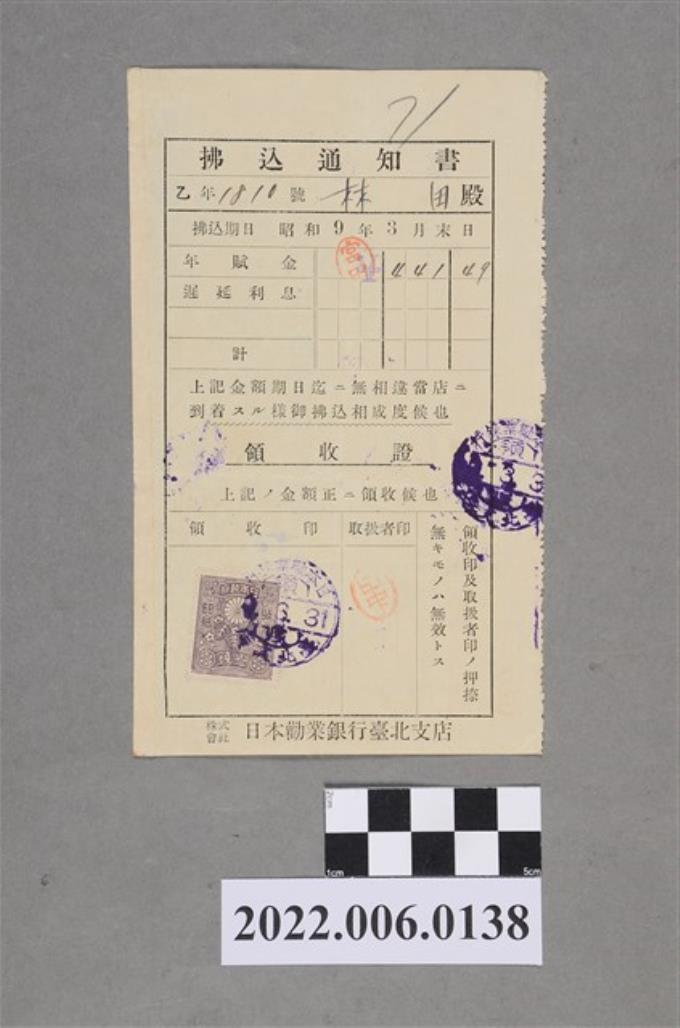 林田收昭和9年日本勸業銀行臺北支店拂込通知書