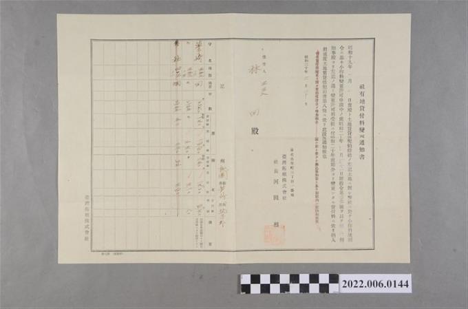 林田昭和20年臺灣拓殖株式會社社有地貸付料變更通知書