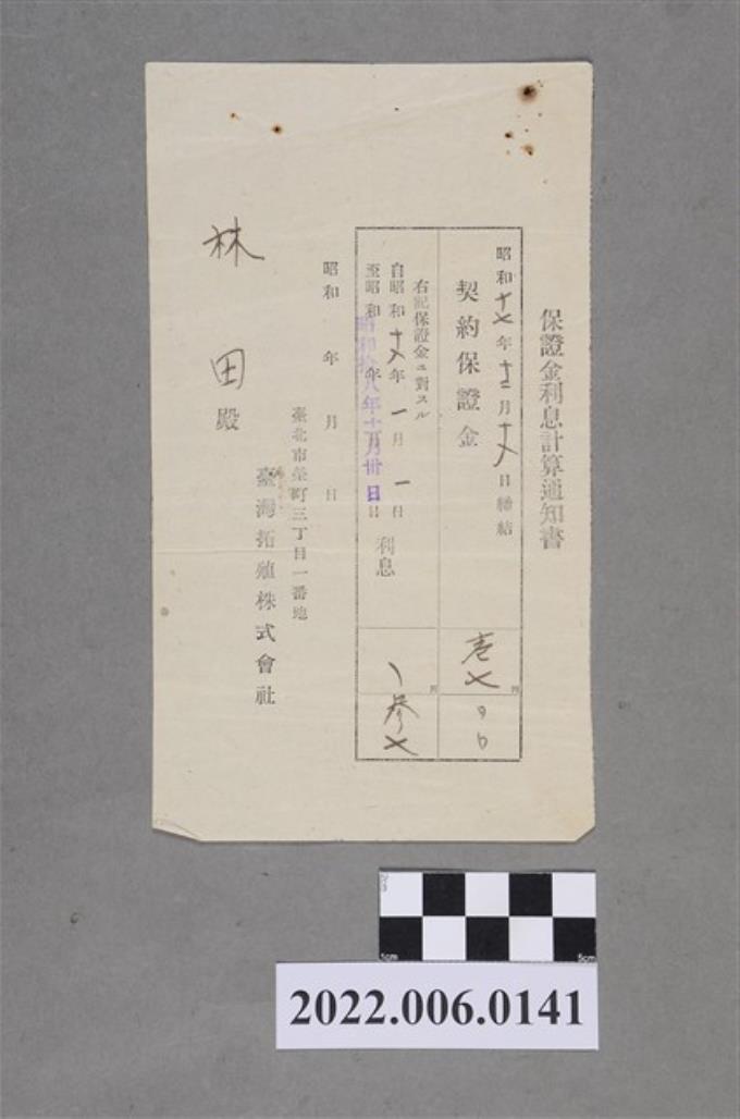 林田昭和17年臺灣拓殖株式會社保證金利息計算通知書