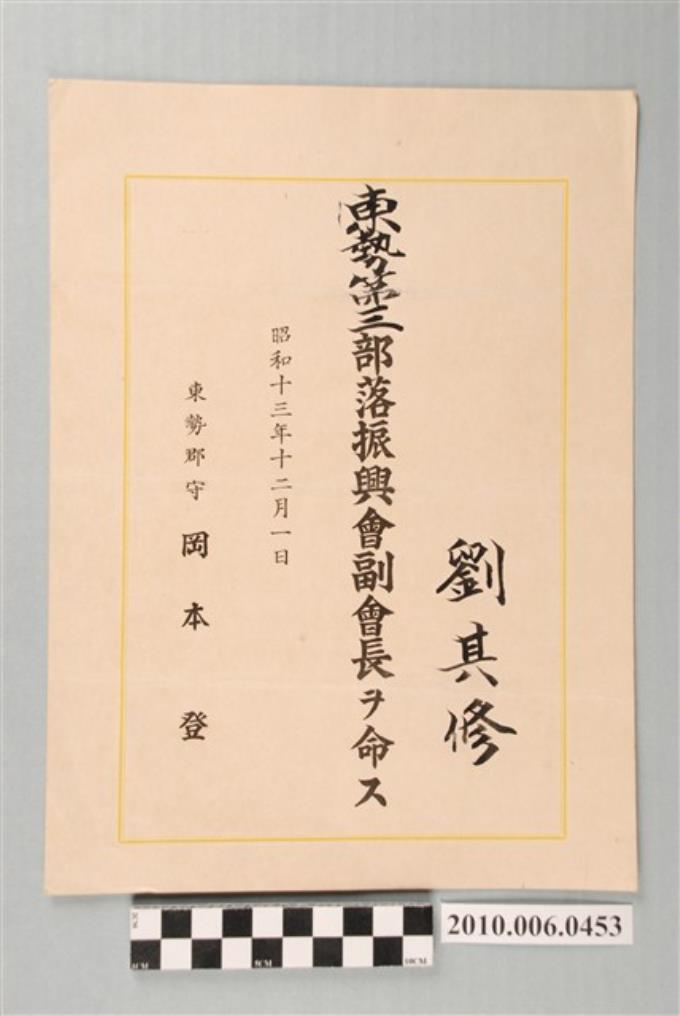 昭和13年劉其修東勢第三部落振興會副會長任命書