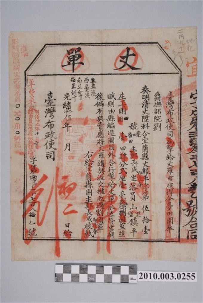 光緒15年臺灣布政使司發給宜蘭縣園主鄭長成丈單