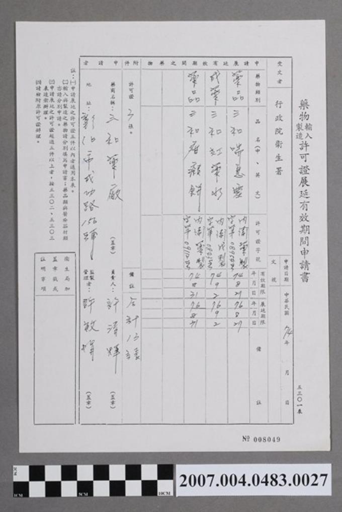 藥物輸入製造許可證展延有效期間申請書008049號