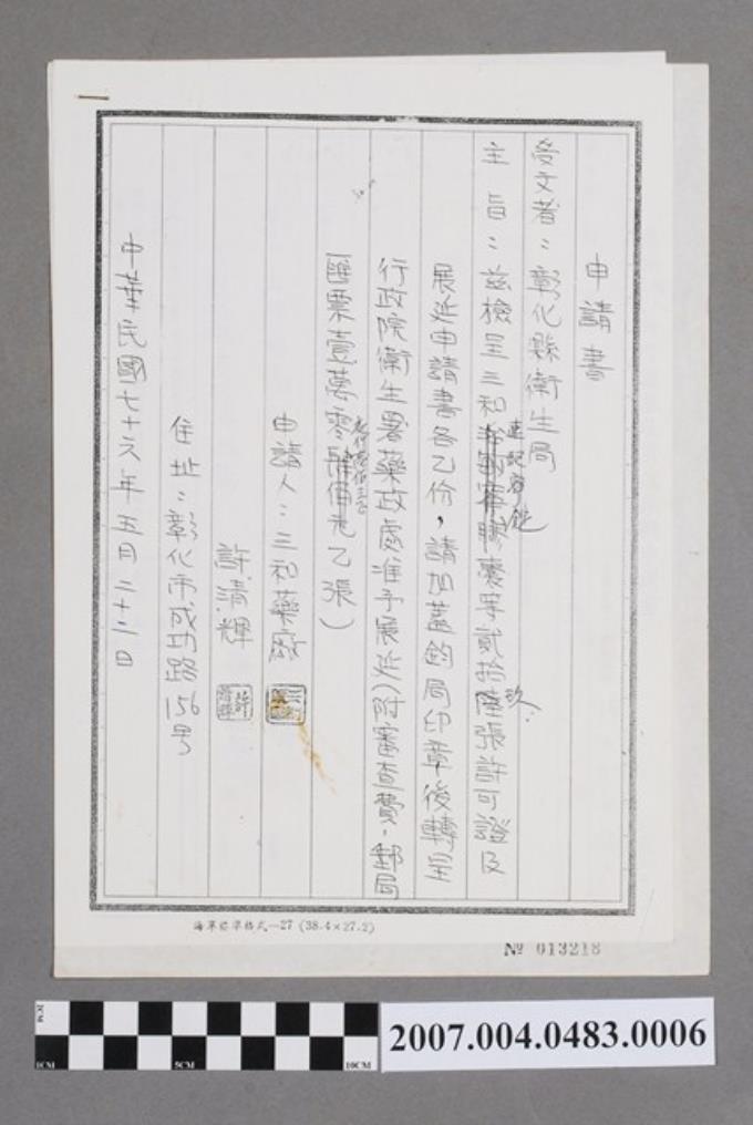三和藥廠致彰化縣衛生局展延申請書