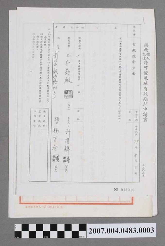 藥物輸入製造許可證展延有效期間申請書013216號