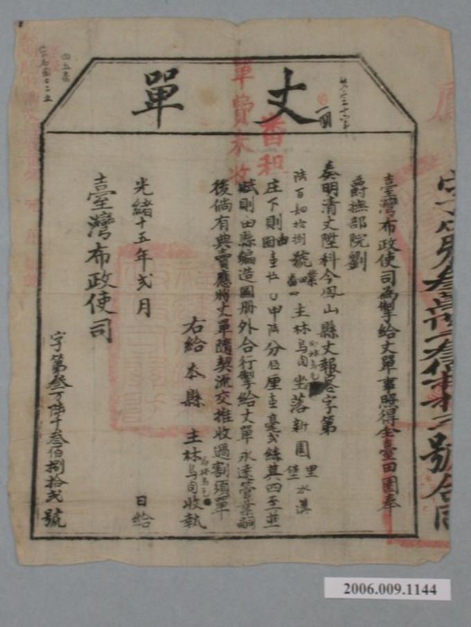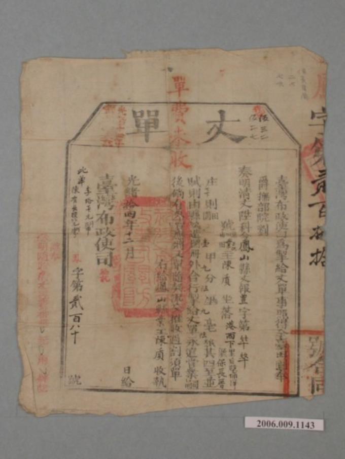 光緒14年臺灣布政使司發給鳳山縣陳質丈單