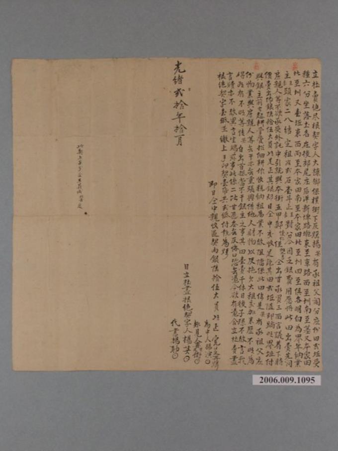 光緒21年大槺榔保樸街下灰熎楊英立杜賣絕盡根契字