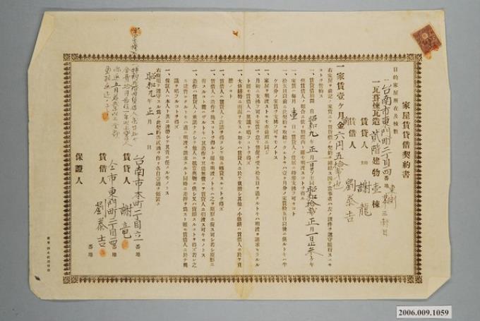 昭和9年臺南市謝龍給劉泰吉家屋賃貸借契約書