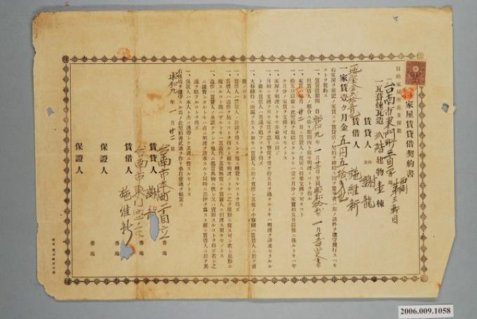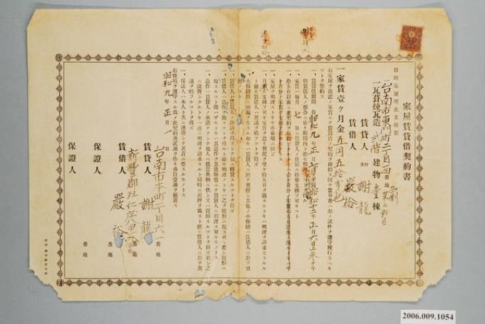 昭和9年臺南市謝龍給施維新家屋賃貸借契約書