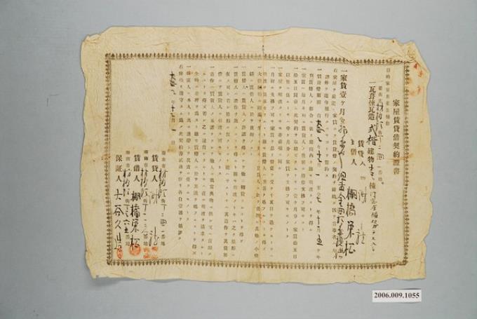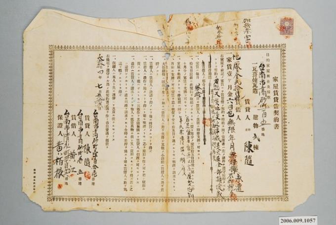 大正2年臺南市謝龍給棚橋榮松家屋賃貸借契約證書