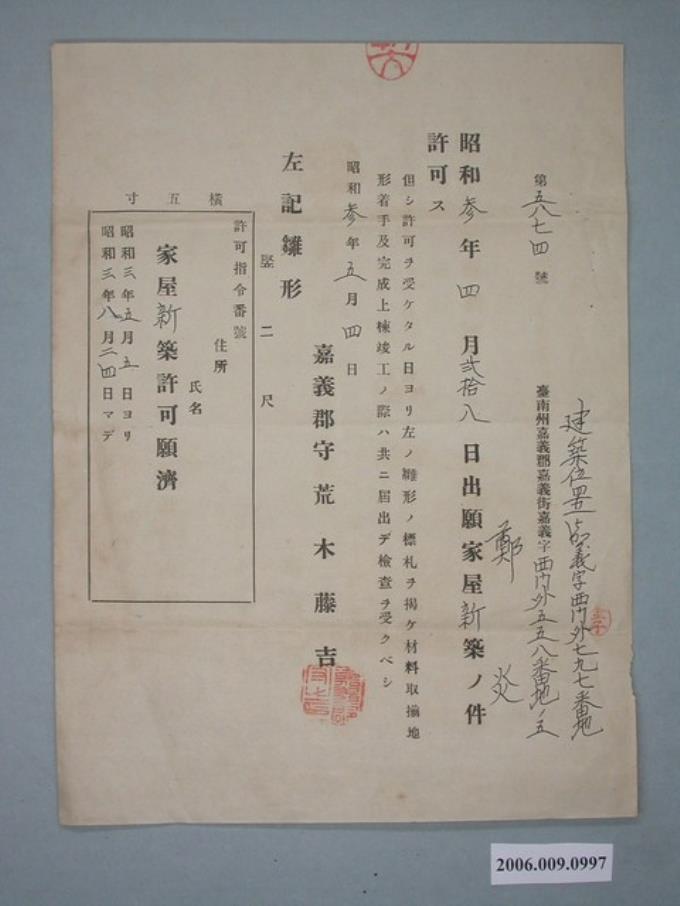昭和3年家屋新築許可證