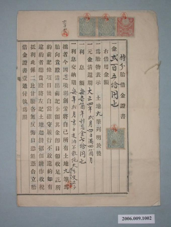 大正2年王永綿給鄭炎之持分胎借金證書