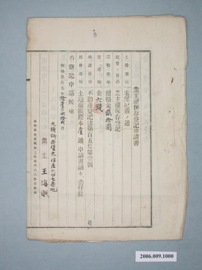 明治39年王海賊立業主權保存登記申請書