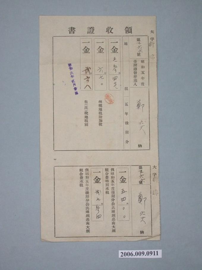昭和6年鄭炎繳納昭和5年度州稅地租與地租附加稅與街庄稅地租割等收據