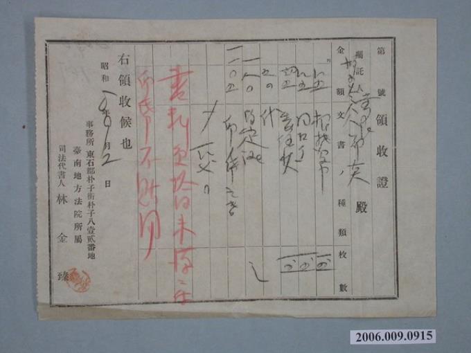 昭和10年臺南地方法院所屬司法代書人林金臻給鄭炎收據