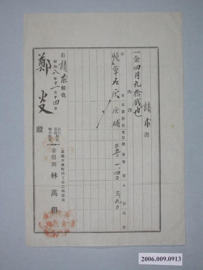 昭和8年嘉義市金德興商號給鄭炎請求書