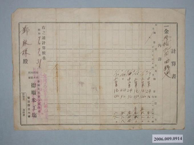 昭和7年嘉義市德順米工塲給鄭啟謙計算書