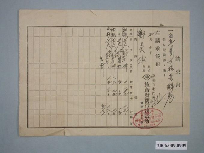 嘉義市株式會社施合發商行出張所給鄭炎請求書