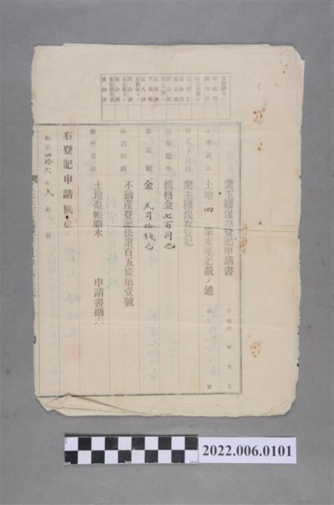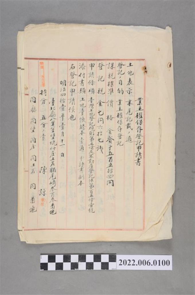 陳諒等6人明治41年土地業主權保存登記申請書