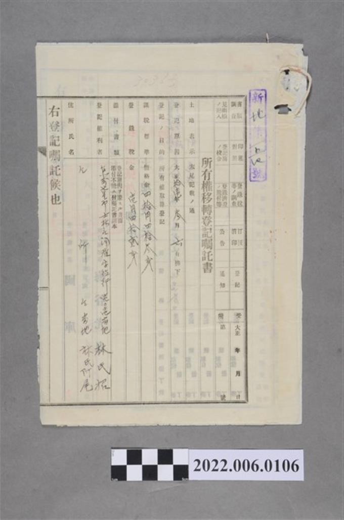 林氏招等2人大正12年所有權移轉登記囑託書