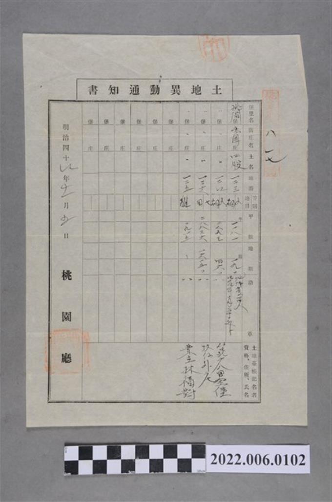林福對明治44年桃園廳桃澗堡竹圍庄四股土地異動通知書