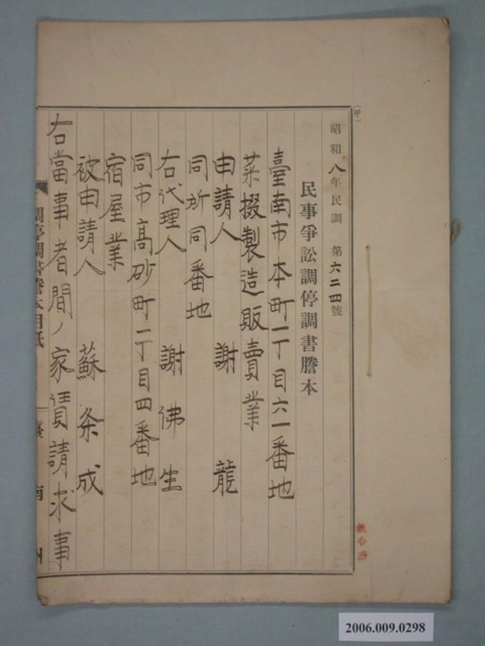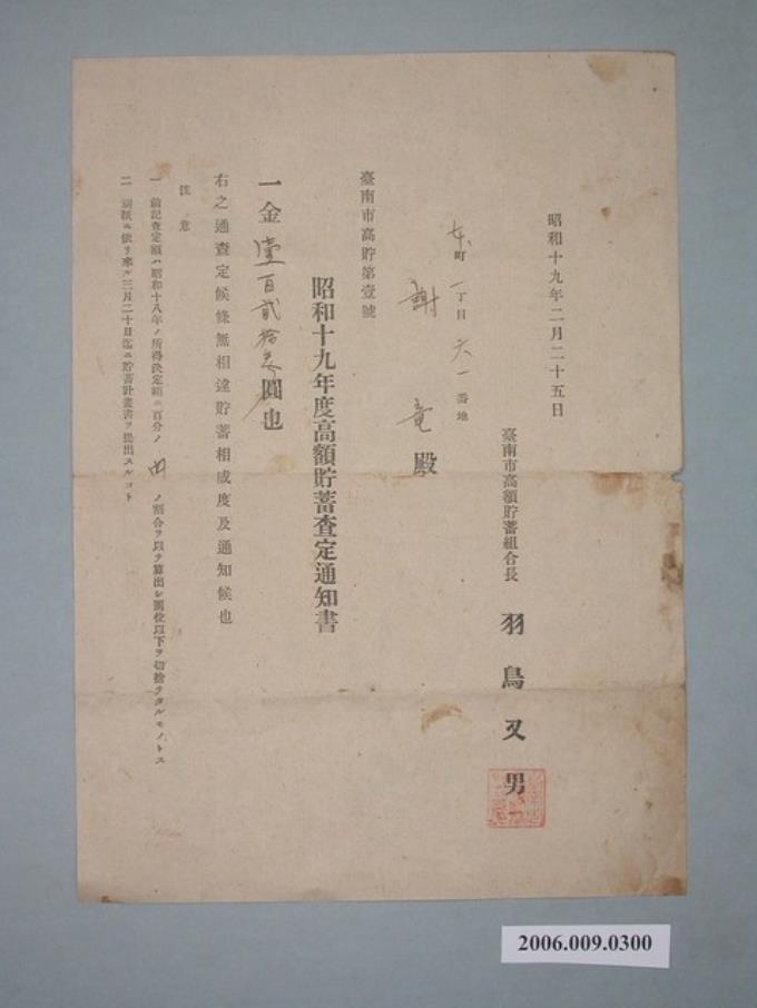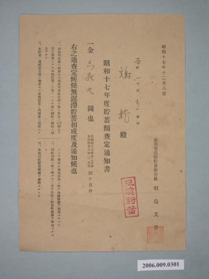 昭和19年臺南市高額貯蓄組合發給謝龍查定通知書及貯蓄要綱