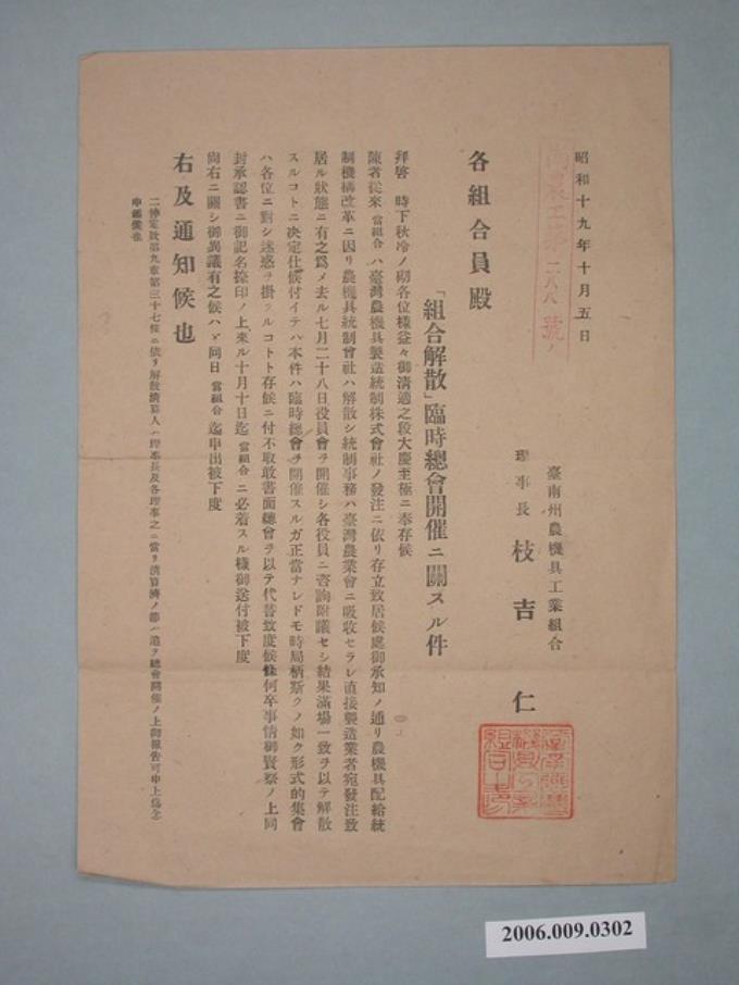 昭和19年臺南州農機具工業組合召開組合解散臨時總會通知書