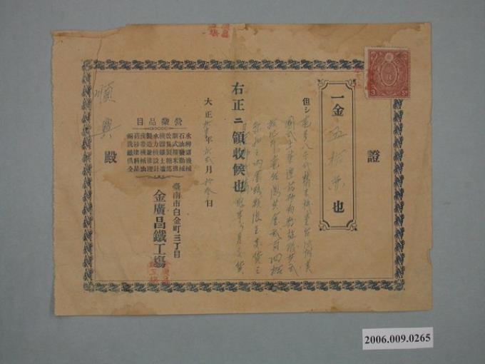 大正11年金廣昌鐵工塲給順興收據