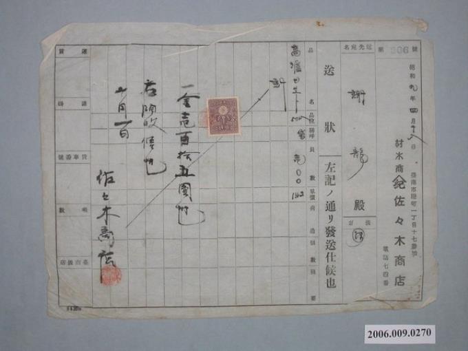 昭和9年臺南市佐佐木商店給謝龍收據