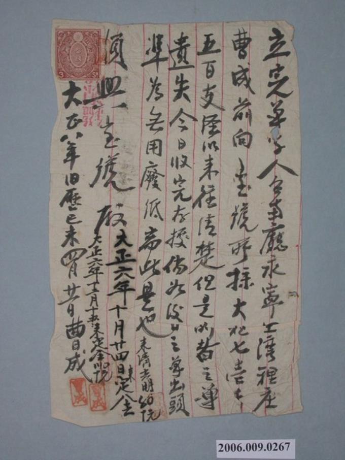 大正8年臺南廳灣裡庄曹成給順興商號單據