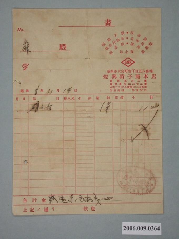 昭和8年燦興硝子商本店給謝龍收據