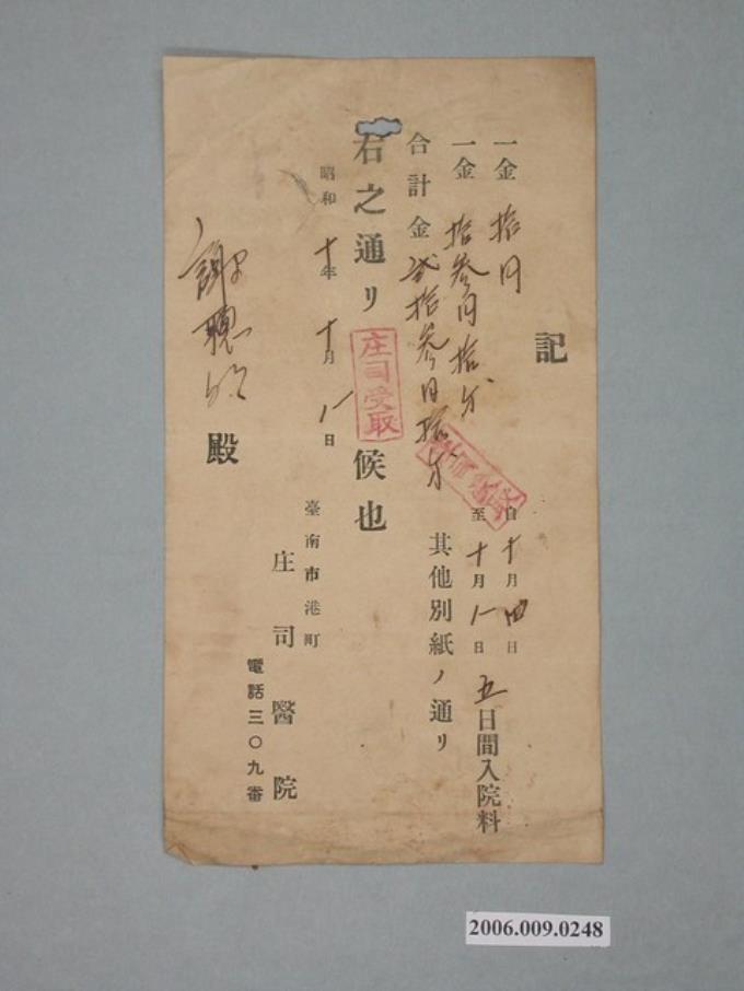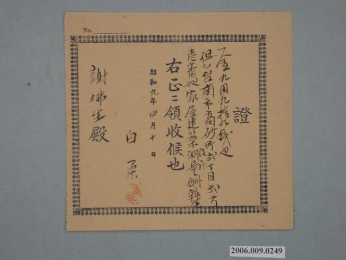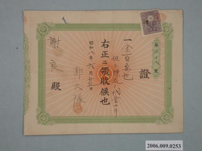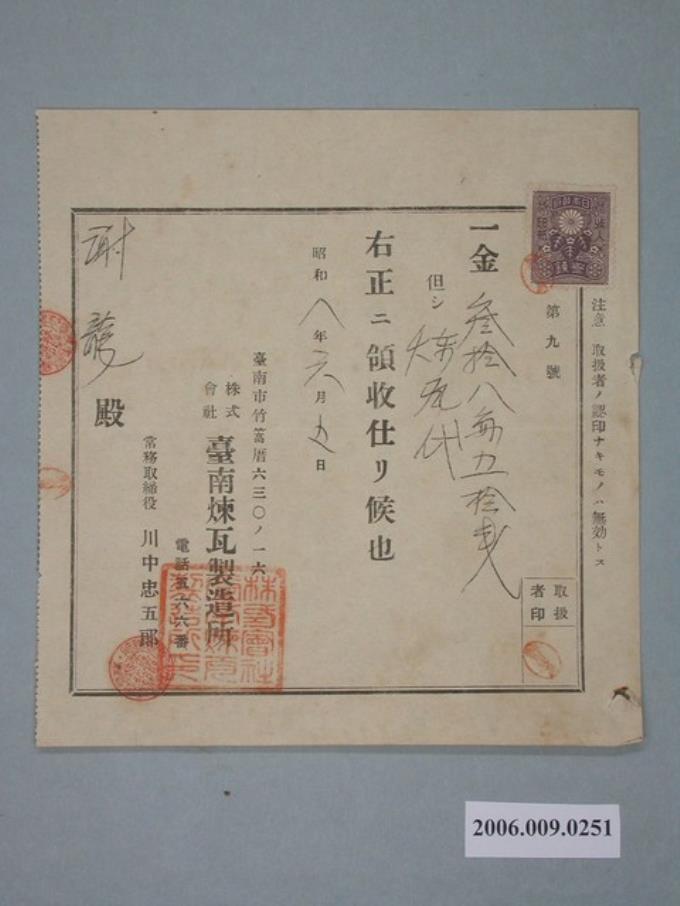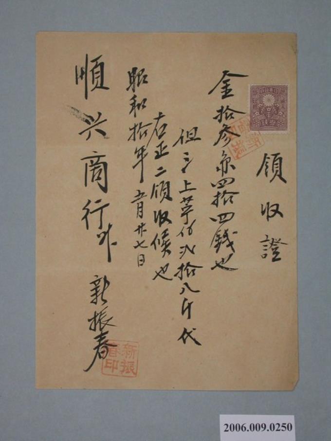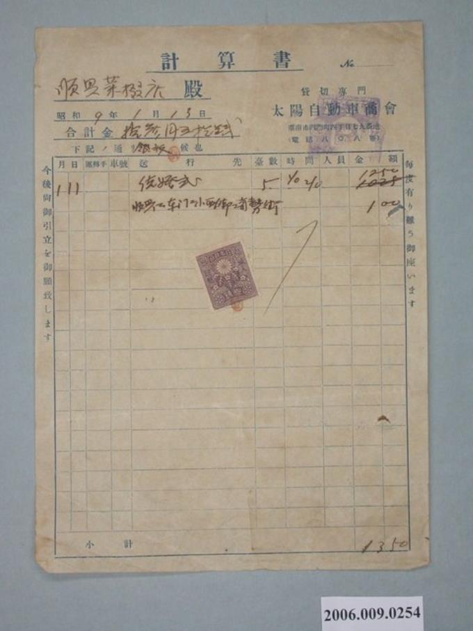 昭和9年臺南市太陽自動車商會給順興業棳店收據